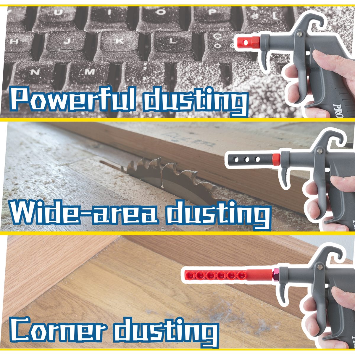 Prowin air alow gun delivers powerful airflow to quickly clear dust and debris. Featuring interchangeable nozzles, it easily reaches narrow gaps and large areas alike. Ideal for auto interiors and machinery, it ensures efficient, thorough, and effortless cleaning for any environment.