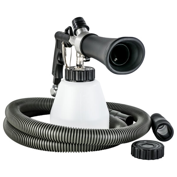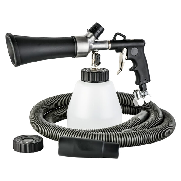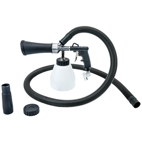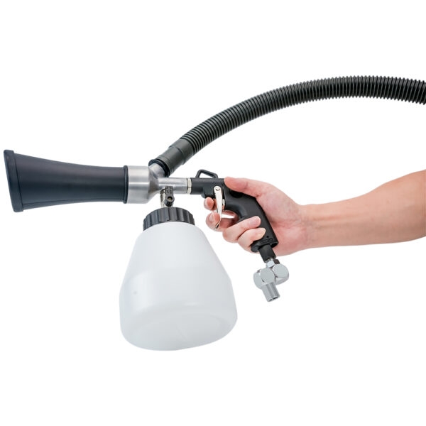 The AT-202S-V Cleaning Gun is a pneumatically operated suction spray gun that both air and liquid cleaners atomizes and swirling sprays with high pressure. The special cleaning liquid is very finely atomized by the Tornado effect in the nozzle of the AT-202S-V and then sprayed onto the soiled surfaces under pressure. As a result, the cleaning effect of the fluid will be used optimally, resulting in a thorough cleaning of all velour interior parts. Also, loose floor mats are getting again spotless with this method.