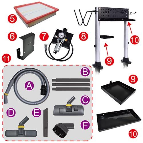 10) Could combine tray and tool set with vacuum cleaner′s function, also the tool set is height adjustable. Including single hook, multifunctional hook and tool hook are able to be placed abrasive paper. Let users have complete storage function and tool assistance, thus the operation is more convenient. (Option)