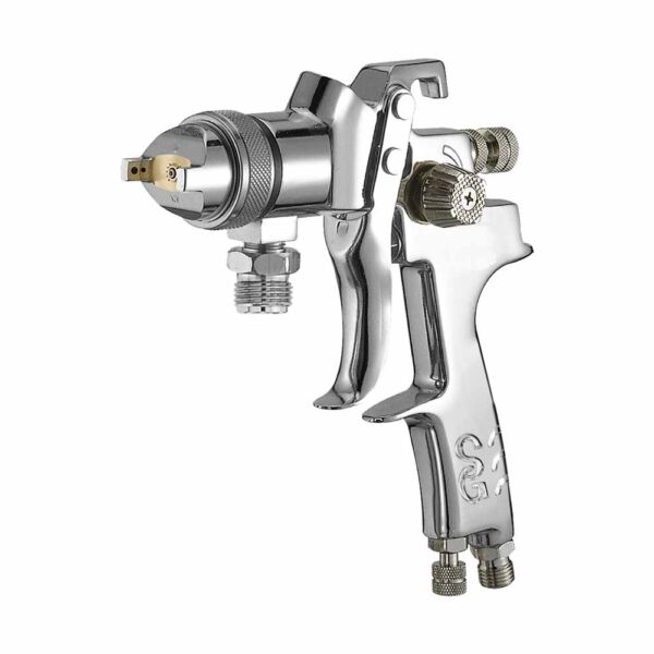 Conventional pressure feed spray gun, suitable for connecting with diaphragm pump or paint pressure tank for mass painting work on construction or industrial purpose. Equipped with a spanner and a cleaning brush.