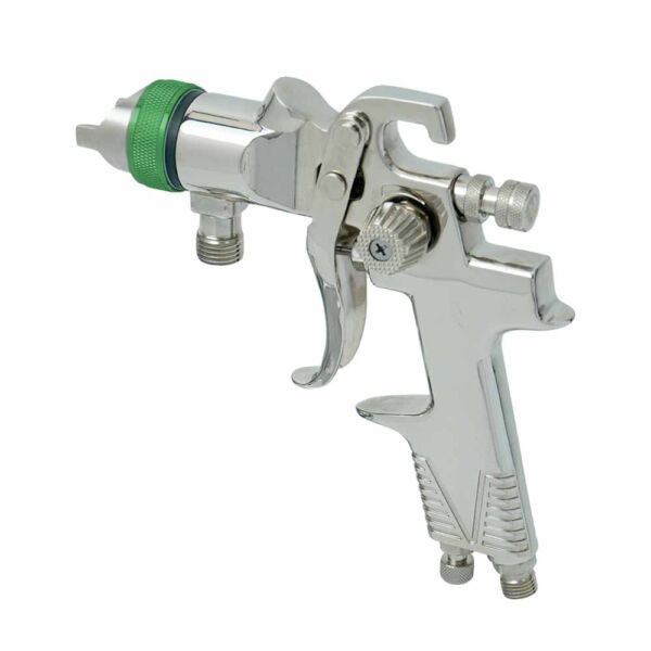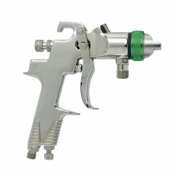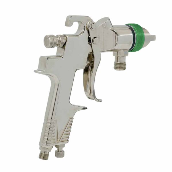 H.V.L.P. pressure feed spray gun with excellent fine atomization, suitable for connecting with diaphragm pump or paint pressure tank for mass painting work on construction or industrial purpose. Equipped with a spanner and a cleaning brush.